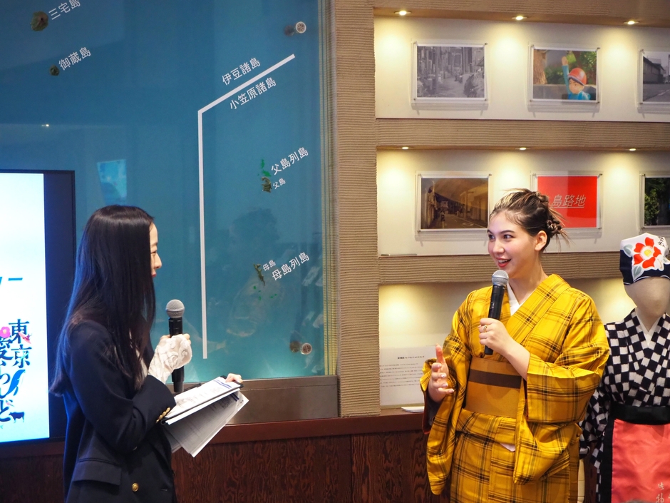 また、今回のトークショーのステージには大島の「あんこ衣装」、新島「大踊」、神津島「島娘」の伝統衣装も用意され、長谷川さんは、MCによる各衣装の特徴を興味深く聞き入っていました。