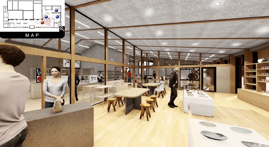 このサイトでは、実際にその場にいるかのように施設内を見て回ることができます。展示・学習コーナー、販売コーナー、工房内のろくろ場、窯場の4か所に“入室”し、インフォメーション(i)のマークをクリックすると、大堀相馬焼の歴史や技法が学べたり、画面上でろくろを回す体験ができたりするほか、販売コーナーからは通販サイトにリンクし、ネットショッピングやZoom陶芸体験が可能です。今後は本サイト上で定期的なイベントの開催も予定しています。
