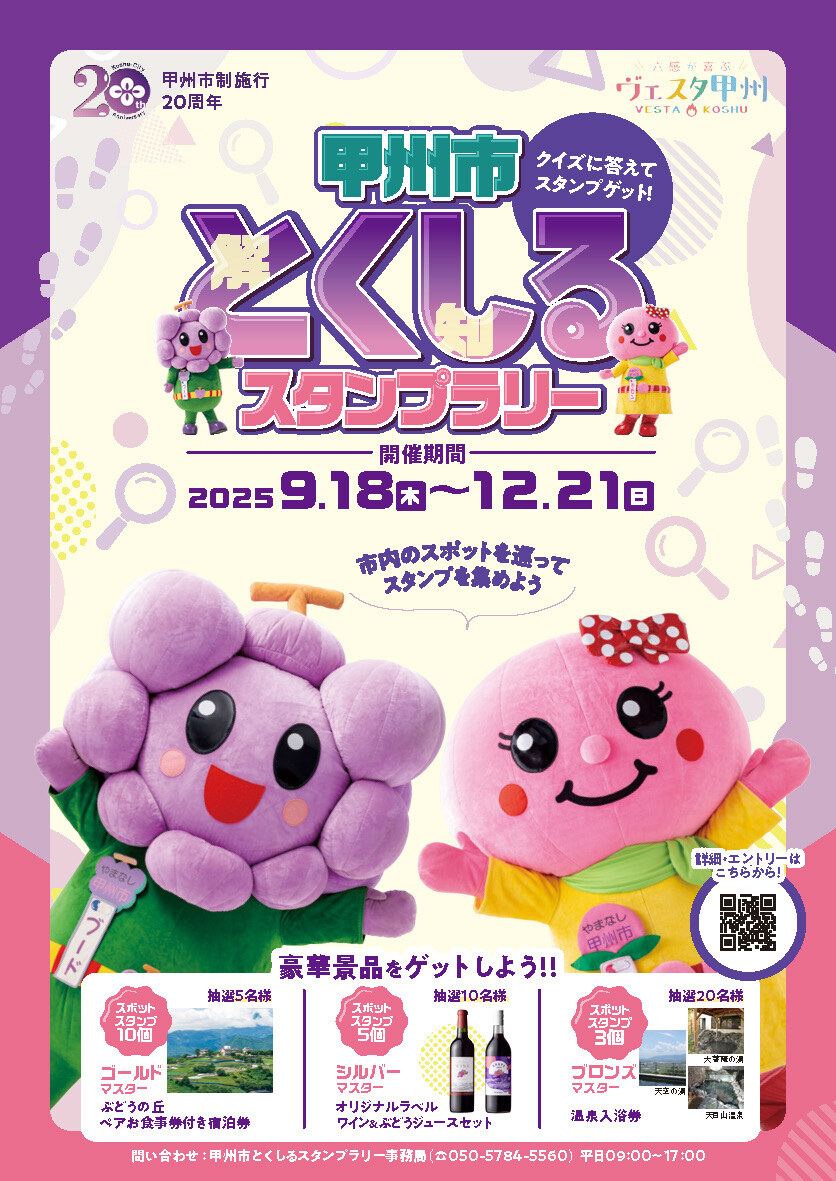 甲州市は、豊かな自然環境と歴史・文化資源を有し、ワイン、果樹園、温泉、神社仏閣など多様な観光資源が点在する地域です。今年で市制施行20周年を迎えたことを記念し、「甲州市とくしるスタンプラリー」を開催します。