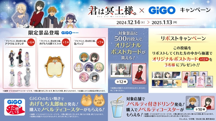 株式会社GENDA GiGO Entertainment(本社:東京都港区 代表取締役社長:二宮 一浩 以下、当社)は、GiGOグループのお店におきまして2024年12月14日(土)より、「TVアニメ」君は冥土様。×GiGOグループのお店キャンペーン」を開催いたします。