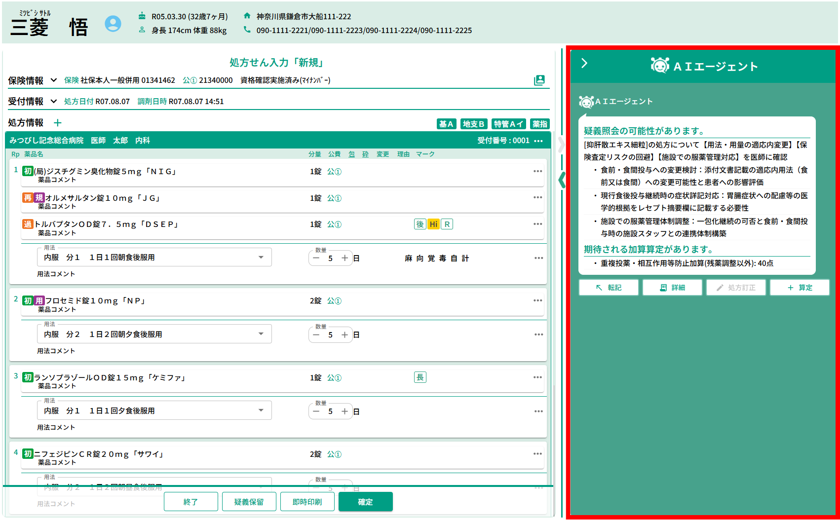 処方データの自動入力や業務提案を行う他、処方内容のチェックや調剤完了時間の目安提示等、薬剤師の業務を支援します。