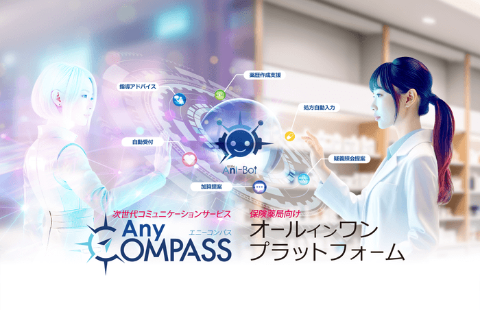 ※4 クラウド版電子薬歴サービスのオプションサービスとして、2025年1月から販売開始したサービス。生成AIを活用したAIアシスタントが「AnyCOMPASS」の有する指導内容データベース、及び過去の指導実績から今回処方箋の情報と照らし合わせ、患者にあった指導内容をアドバイス。また、患者属性情報・患者基本確認情報・処方内容、及び患者と薬剤師との会話情報から、AIアシスタントがSOAP形式の薬歴を自動生成することで、薬歴記載業務の効率化を実現。