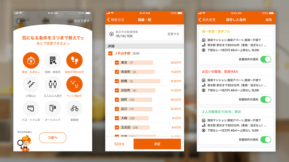 2009年12月に国内業界初の住まい探し専用アプリとして、iPhoneアプリをリリースいたしました。その後、Android、iPad、Windows8、Android Wear、Apple Watch、Apple TVなど幅広いデバイスに対応し、各デバイスの特性に応じた機能や操作で、使いやすさ・探しやすさを追求しています。2017年5月には、累計500万ダウンロードを突破いたしました。