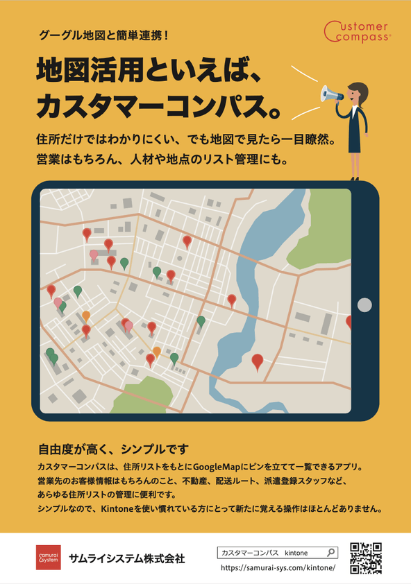 ソフトウェア開発を行うサムライシステム株式会社(所在地:大阪府大阪市北区、代表取締役社長:田畑 昌平)は、「顧客情報・商談情報を地図で可視化」するサービス「カスタマーコンパス」のKintone版を2023年3月14日より提供開始しました。Salesforce版は引き続き提供中です。