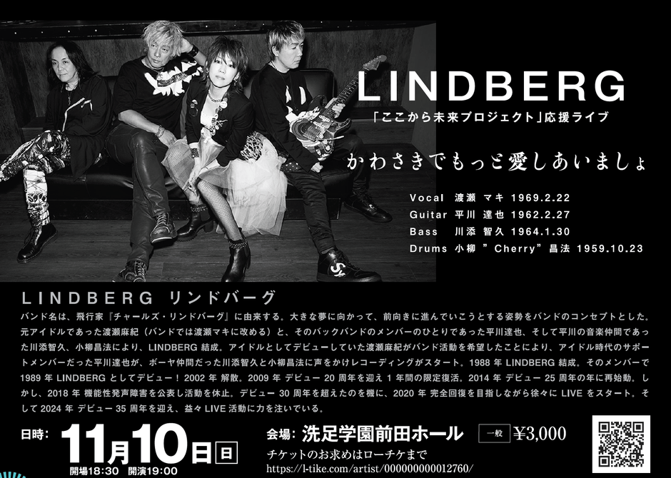 川崎市は市制100周年、音楽のまち「かわさき」は20周年を迎える今年。川崎市市制100周年記念事業として音楽の力で川崎市を活性化させるプロジェクト『ここから未来プロジェクト』において、2024年11月10日(日)伝説のロックバンド【LINDBERG】が、洗足学園音楽大学前田ホールでスペシャルライブを開催いたします。川崎市と同じく100周年を迎える洗足学園音楽大学で、川崎市市制100周年を盛り上げます!