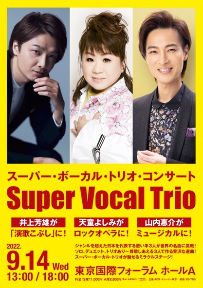 9.14 とんでもないことが起こる!井上芳雄が!天童よしみが!山内惠介が!新境地に挑戦。「スーパー・ボーカル・トリオ・コンサート」開催近づき曲目一部発表!