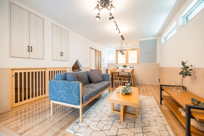 わんちゃんやねこちゃんとの暮らしを快適に心地良くするために「アレルギー反応を抑制する壁材」「ナノイー発生器のエアイー」「室内外用の洗い場」「すべりにくく、耐水性に配慮されたフローリング」「誤飲防止のためのキッチンゲートやデコ窓」などを実際にご見学いただけます。