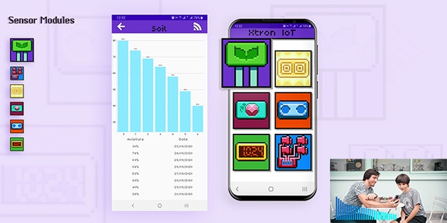 Xtron Proでは様々な機能を持ったセンサーキットを用意しています。そのうちの「土壌水分センサーモジュール」と組み合わせると植物観察キットが完成します。