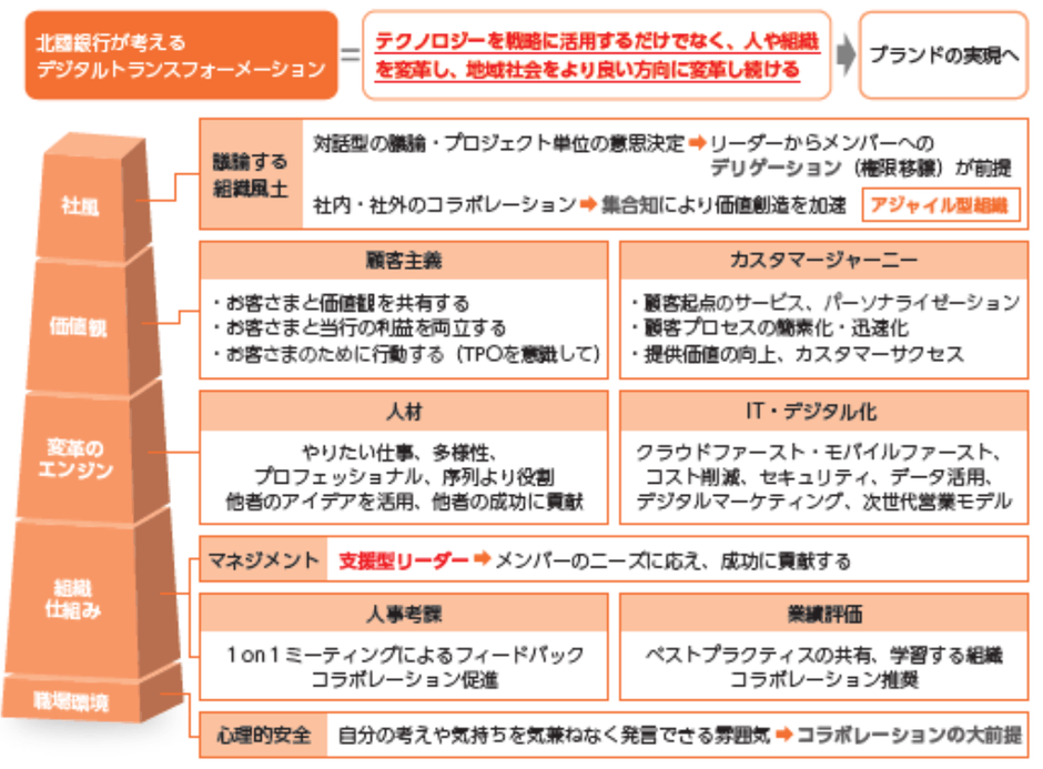 当行は、DXを単なるテクノロジーの活用だけでなく、広い定義での働き方(意思決定プロセス、権限、判断基準、組織文化)等、銀行そのものをデジタルで根本的に変革することと定義し、プロジェクトをベースとしたアジャイル型組織体制の構築、オープンなコミュニケーションを実現するための基盤の整備、リカレント教育などに積極的に取り組んでいます。