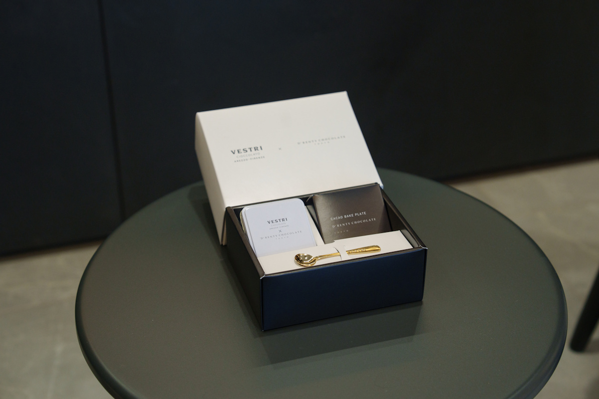数量限定の『DUETTO BOX(ドゥエット・ボックス)』には、VESTRIを代表する『アンティーカ・ジャンドゥイア・カップッチーノ(スプーン付き)』と、D'RENTY CHOCOLATEの『カカオベイクプレート』3枚パックをパッケージ。