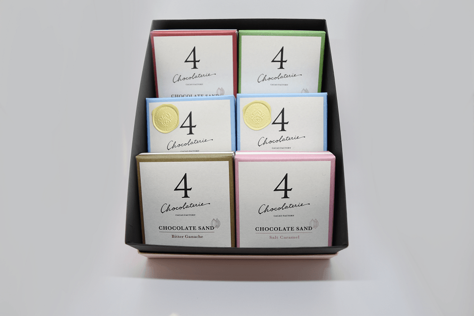 チョコレートは大変繊細な商材であり、温度・湿度管理から細部まで気を使いながらスイーツとして加工する必要があります。そんな扱いが非常に難しいチョコレートをChocolaterie4は最上品質の商品を提供するため、商品を一つ一つ職人が手作りしております。また使用している素材は安心安全の国産のもの、フレーバーなどの特別な部分では三重県の特産品を使用しており、三重・四日市という土地を大事にし、職人の感性を活かすことでこの店でしか味わえない特別なチョコレートスイーツ商品を開発しております。職人たちが個性を発揮した商品たちは、上質なカカオと新しい香り、食感、風味を生むような、異なる素材の掛け合わせを大切にしており、様々な素材の組み合わせによって生まれる、マリアージュをお楽しみいただけます。