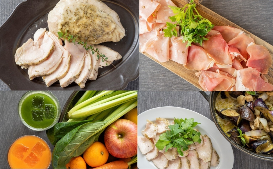 (左上)美味鶏の自家製ハム (右上)フランス産生ハム&オーストラリア産ハム