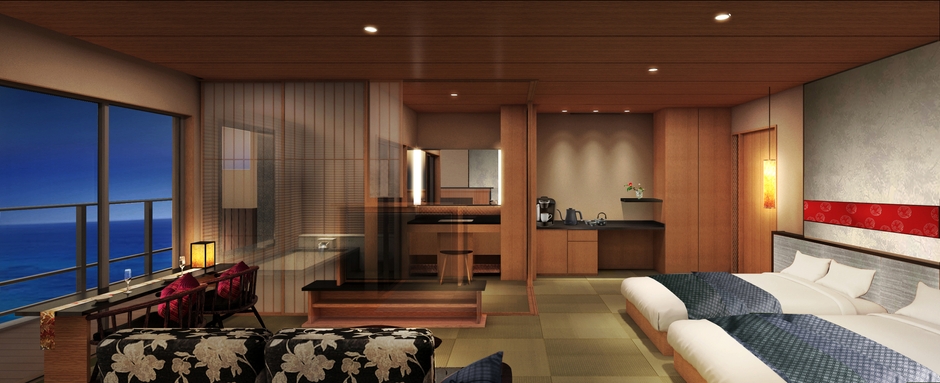 よりゆったりとしたルームレイアウトに雄大なピクチャーウィンドウ、夕日を楽しみながら入れる各部屋の展望温泉など、大人のためだけの贅沢な設備を充実させました。