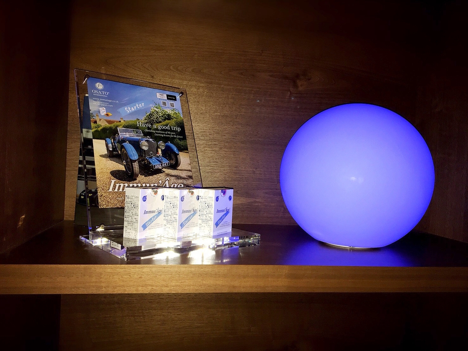 The House of Aston Martin Aoyamaの営業開始予定日である11月21日からImmun'Age・Starterも販売される予定です。快適なドライブを楽しんでもらいたいという思いが込められた「Have a good trip」の文字をあしらったフライヤーと旅先でも持ち運びやすいサイズのImmun'Age・Starterが並ぶディスプレイが目印です。
