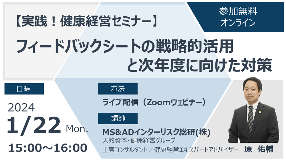 MS&ADインシュアランス グループのMS&ADインターリスク総研株式会社(代表取締役社長:一本木 真史)は、健康経営セミナー「フィードバックシートの戦略的活用と次年度に向けた対策」を2024年1月22日(月)にオンライン開催いたします。