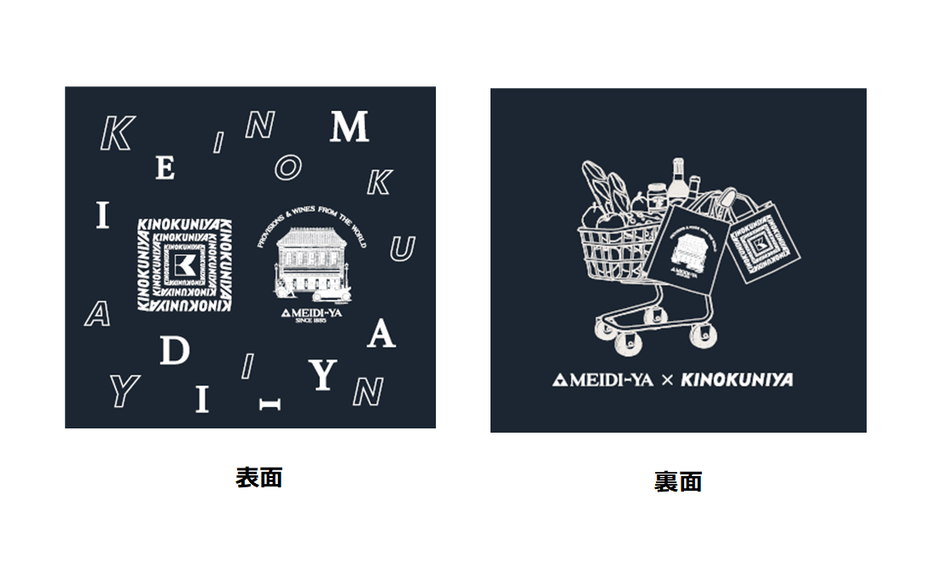 明治屋創業140周年、紀ノ国屋創業115周年を記念した初めてのコラボレーションバッグ。表はそれぞれのロゴとアルファベットを散りばめ、裏は明治屋・紀ノ国屋どちらの店舗でもお買い物を楽しんでいただきたい、という想いを込めたデザインとなっております。