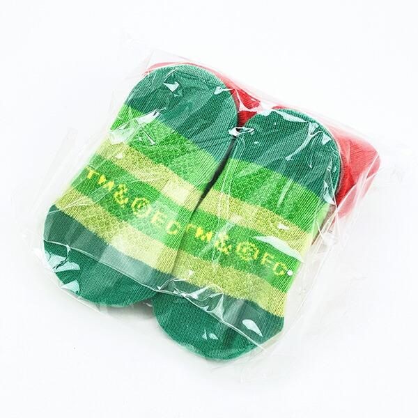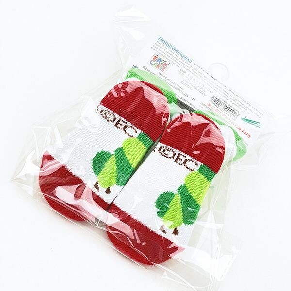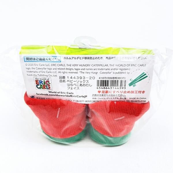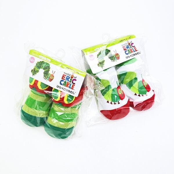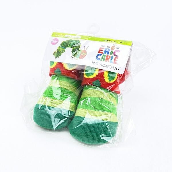 こちらははらぺこあおむしのベビーソックスです。対象年齢は0~1歳 サイズは7~9cm カラフルなあおむしのイラストが目を引くデザインです。赤や緑の鮮やかな色合いは見ているだけでワクワクした気持ちになります。