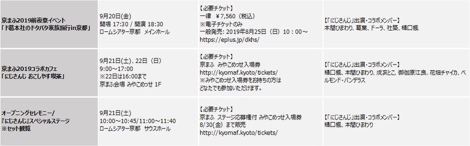 西日本最大級のマンガ・アニメイベント 『京都国際マンガ・アニメフェア2019』 ■「にじさんじ おこしやす喫茶」メンバー 接客配信スケジュール決定■ ■「あんさんぶるスターズ!」アニメイトキッチンカーが 京まふ会場に登場!■ ■「にじさんじ」京まふ2019特番[京まふ情報局]スタート■ ■優先入場券 8月29日(木)10:00より販売開始!■ ■京まふステージ応募権付入場券8月30日(金)まで販売!■