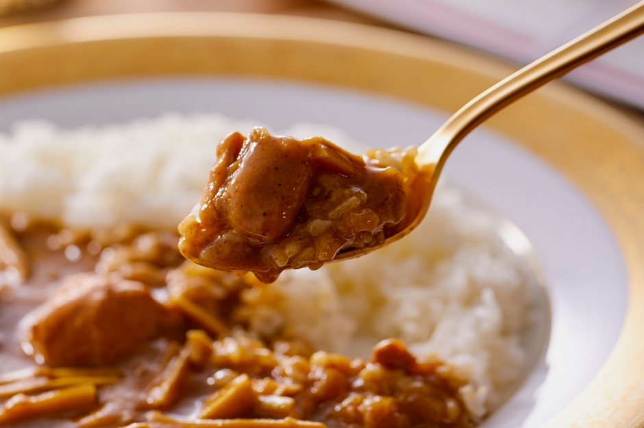 和風だしの効いたカレーソースに、ゴロッと大き目カットの鶏肉と、歯ごたえシャキシャキのたけのこをたっぷり入れた満足感のあるカレーです。