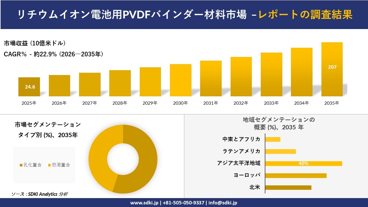 提出日 (2026年04月17)、SDKI Analytics(本社:渋谷区、東京都)は、2026年と2035年の予測期間を対象とした「リチウムイオン電池用PVDFバインダー材料市場」に関する調査を実施しました。