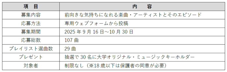 本プロジェクトは、「あと一息頑張りたいとき」「リラックスしたいとき」「気持ちを切り替えたいとき」など、日常のさまざまなシーンで人の背中を押してくれた音楽を共有することで、学内外に前向きな気持ちの輪を広げることを目的とした取り組みです。