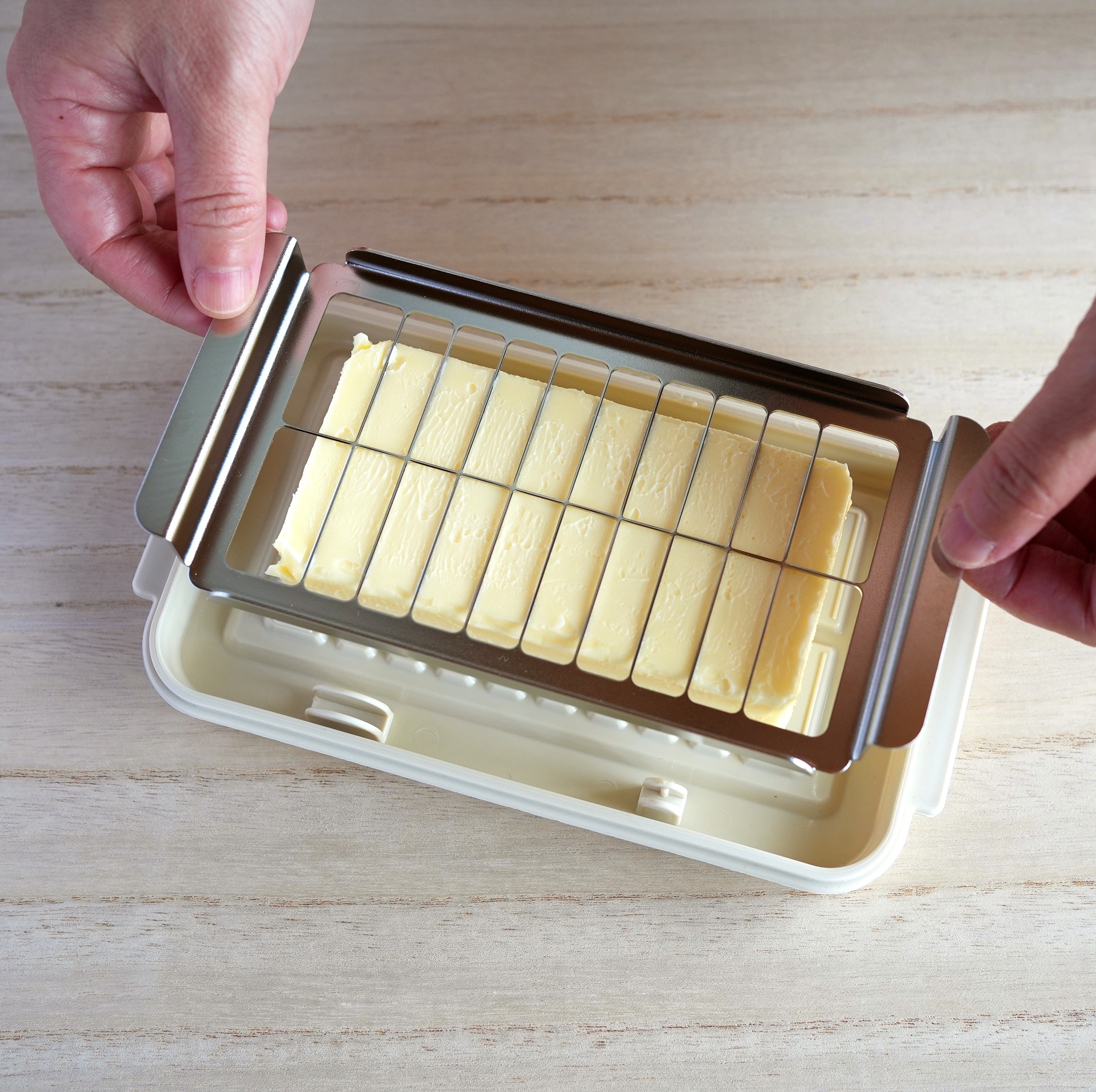 付属のバターカッターで、200gのバターを一度に20個(約10g)にカットして保存できます。また、専用ナイフで使いたい分だけ簡単に取り出せるので、忙しい朝や調理中にもスムーズに使えます。