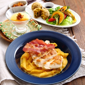 かぼちゃの実の部分を使用した、たっぷりクリームソースのペンネです。ベーコンと鶏肉の旨味がしっかり味わえる濃厚ソースが絶品!