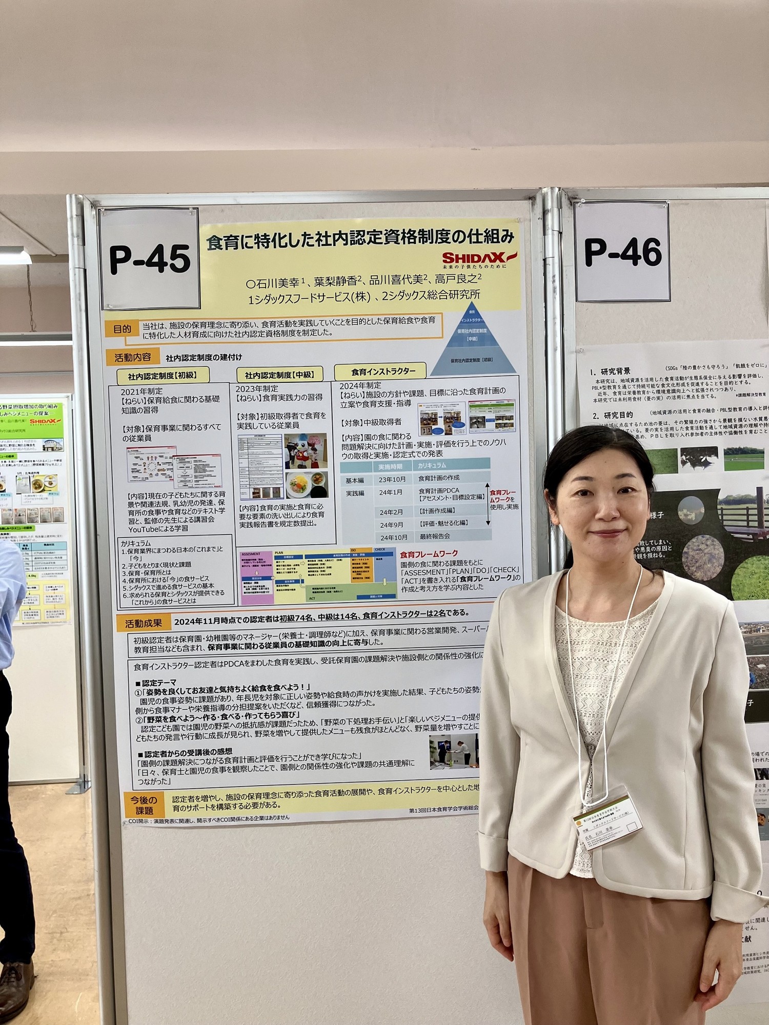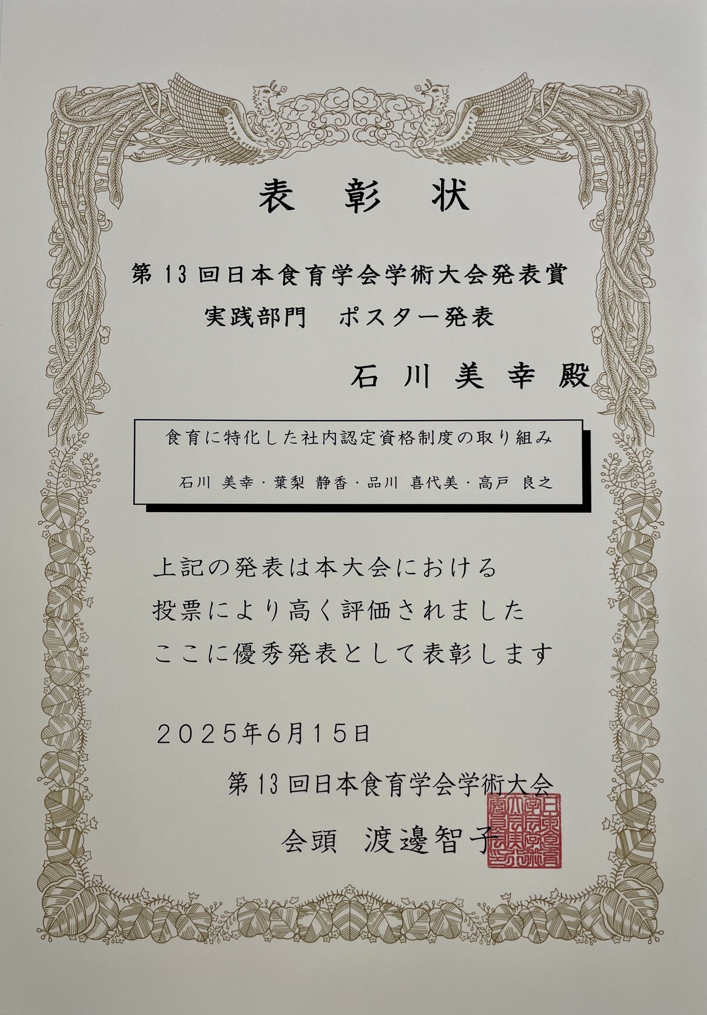 2025年6月に東京栄養食糧専門学校で開催された「第13回日本食育学会学術大会」では、当社管理栄養士によるポスター発表「食育に特化した社内認定資格制度の取り組み」が実践部門「優秀発表賞」を受賞しました。