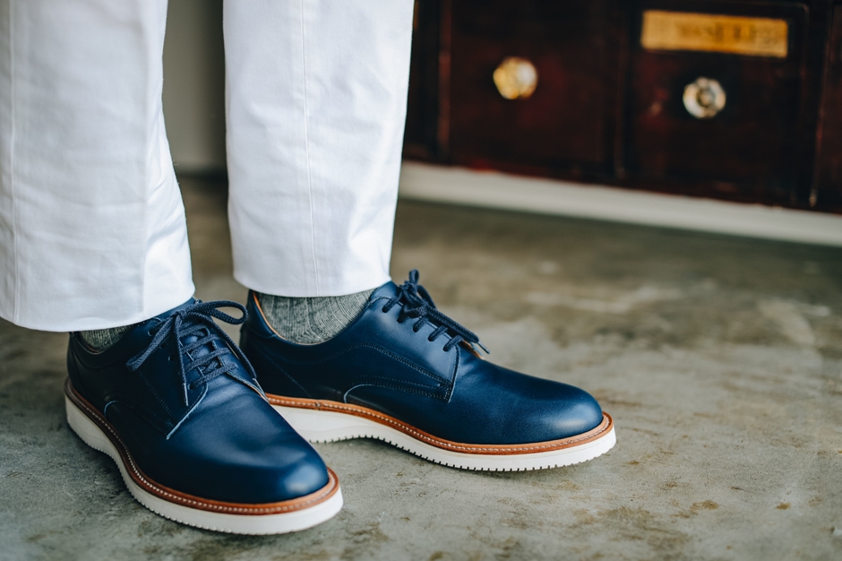 5年目の2020年モデルのコンセプトは「ビジネスシューズとスポーツの融合」。「ジャパン・ブルー」とも呼ばれる藍染めのしなやかなレザーを使い「和」のテイストも感じられる特別な一足。革の発色の良さを生かす生地色のコバ周りやホワイトのビブラムソール、シンプルなプレーントウに履き口周りには当たりの柔らかなパッドを配し、軽快なスニーカー感覚で履けるシューズに仕立てた。「2020」の刻印、細部に至るまで贅沢な