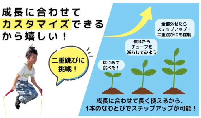 (3)成長に合わせたカスタマイズ:慣れてきたらチューブを外すことができ、最終的には二重跳びも可能な本格的ななわとびとして長く使えます。縄を切らなくても調整できるので、その場で跳びやすい長さに合わせられます。