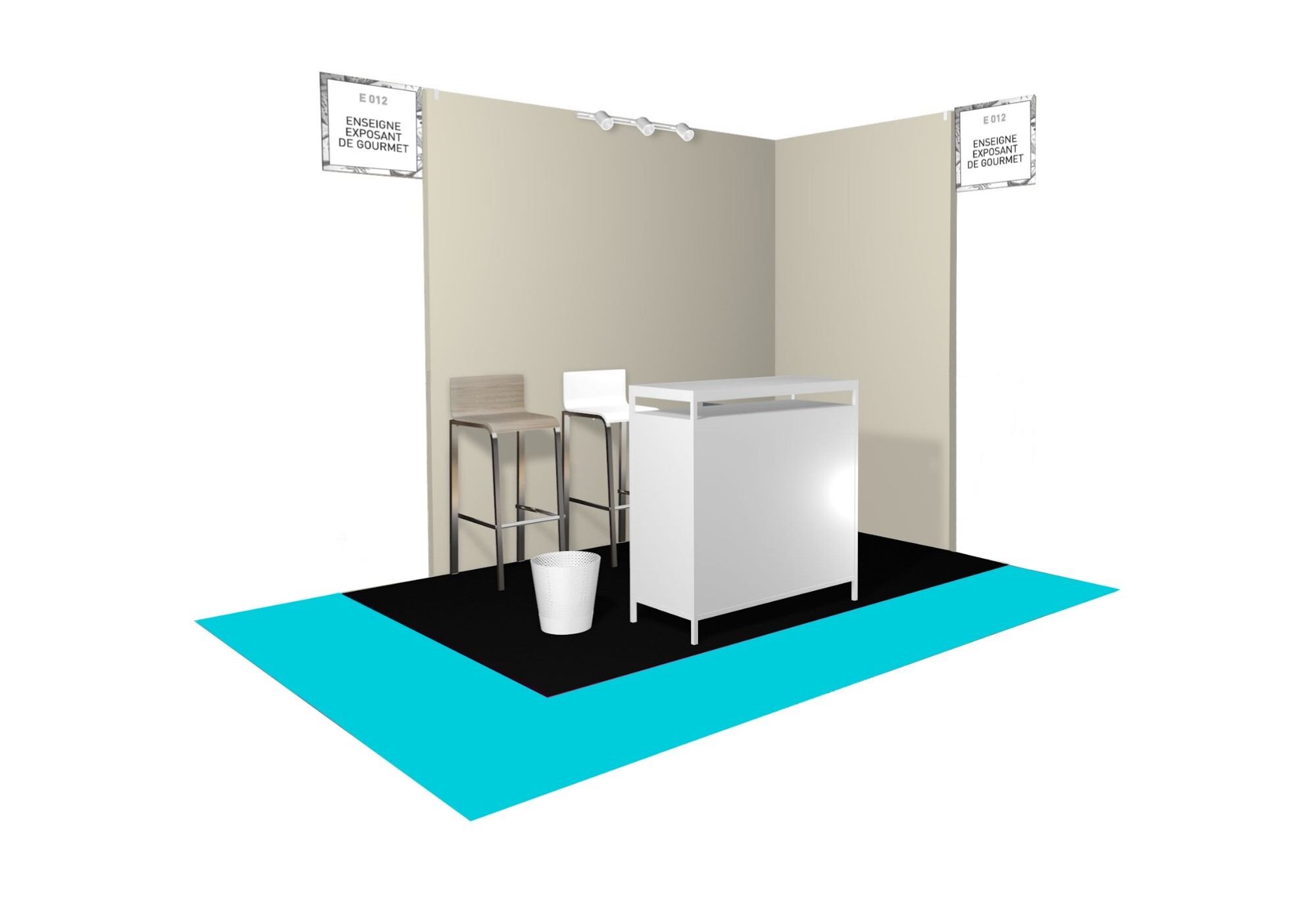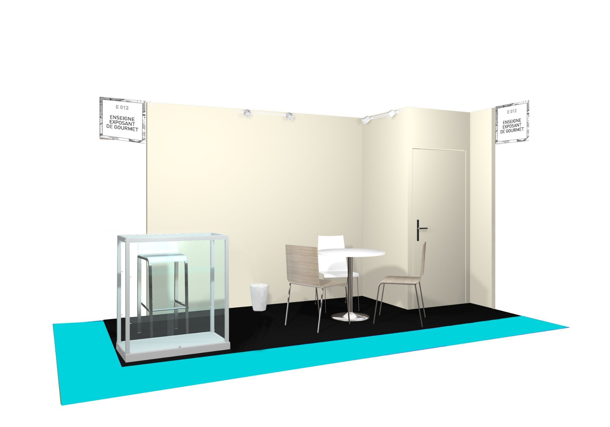 ベージュの布で覆われた木製パーティション、カーペット(ブラック)、出展者名とブース番号入り看板 1枚、施錠可能な収納スペース(1m2)、3キロワットの電源ボックス(展示会営業時間のみ) トリプルソケット 1個、スポットライト 1個/3m2(9m2のスタンドには2スポット付きラック2本)、受付カウンター(バックライト付きショーケース&電源接続)、ハイスツール 1脚、テーブル 1台、椅子 3脚(ホワイト)、ゴミ箱 1個、前日並びに展示会中の清掃