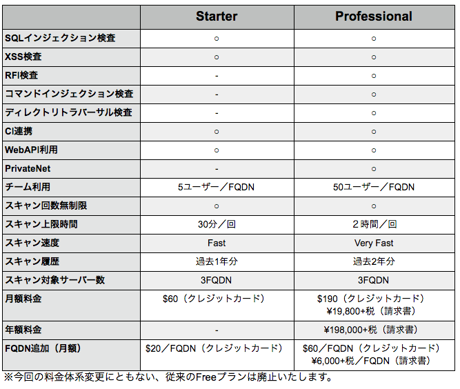 ・Standardプラン(月額$100)を廃止し、Starterプラン(月額$60)を新設します。検査項目をSQL injection検査とクロスサイト・スクリプティング(XSS)検査のみに限定することによって、旧Standardプランよりもお求めやすい価格でご利用いただけます。