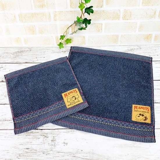タオルなのにデニムカラー!?と驚かれるかもしれない、スヌーピーのタオルハンカチです。デニムに付いていそうなタグがより雰囲気を上げます。タオルはジャガー織りになっており、吸水力は抜群◎