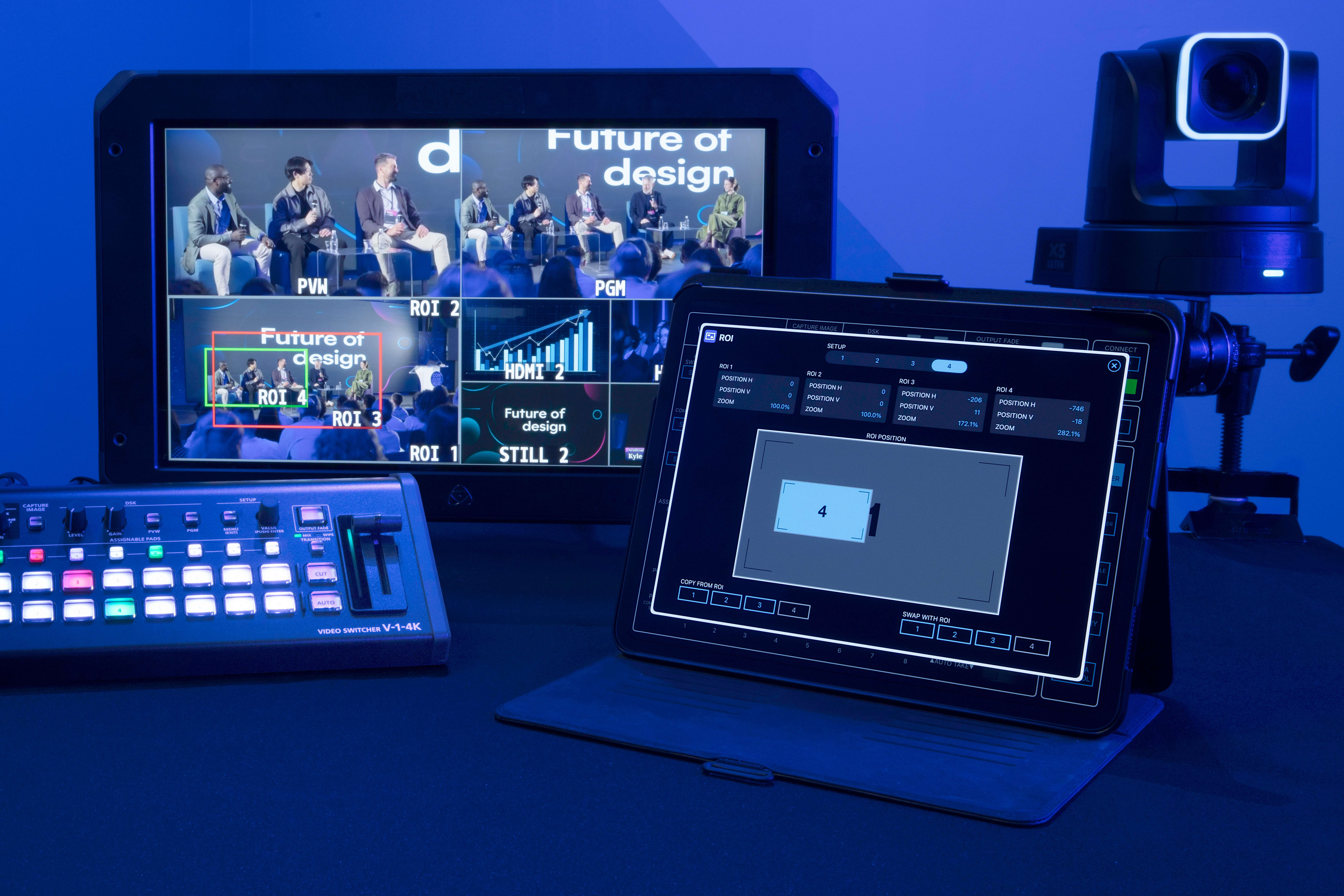 さらに、『V-1-4K』は、4Kカメラ1台の映像から最大4つのHD映像を切り出せるROI(Region of Interest)モードを搭載。全景や話者のアップなどの映像を作り分け、疑似的なマルチカメラ演出を行うことができます。さらに、ROI専用マルチビューで切り出し範囲をひと目で確認でき、少人数の現場でも効率的な映像演出を実現します。