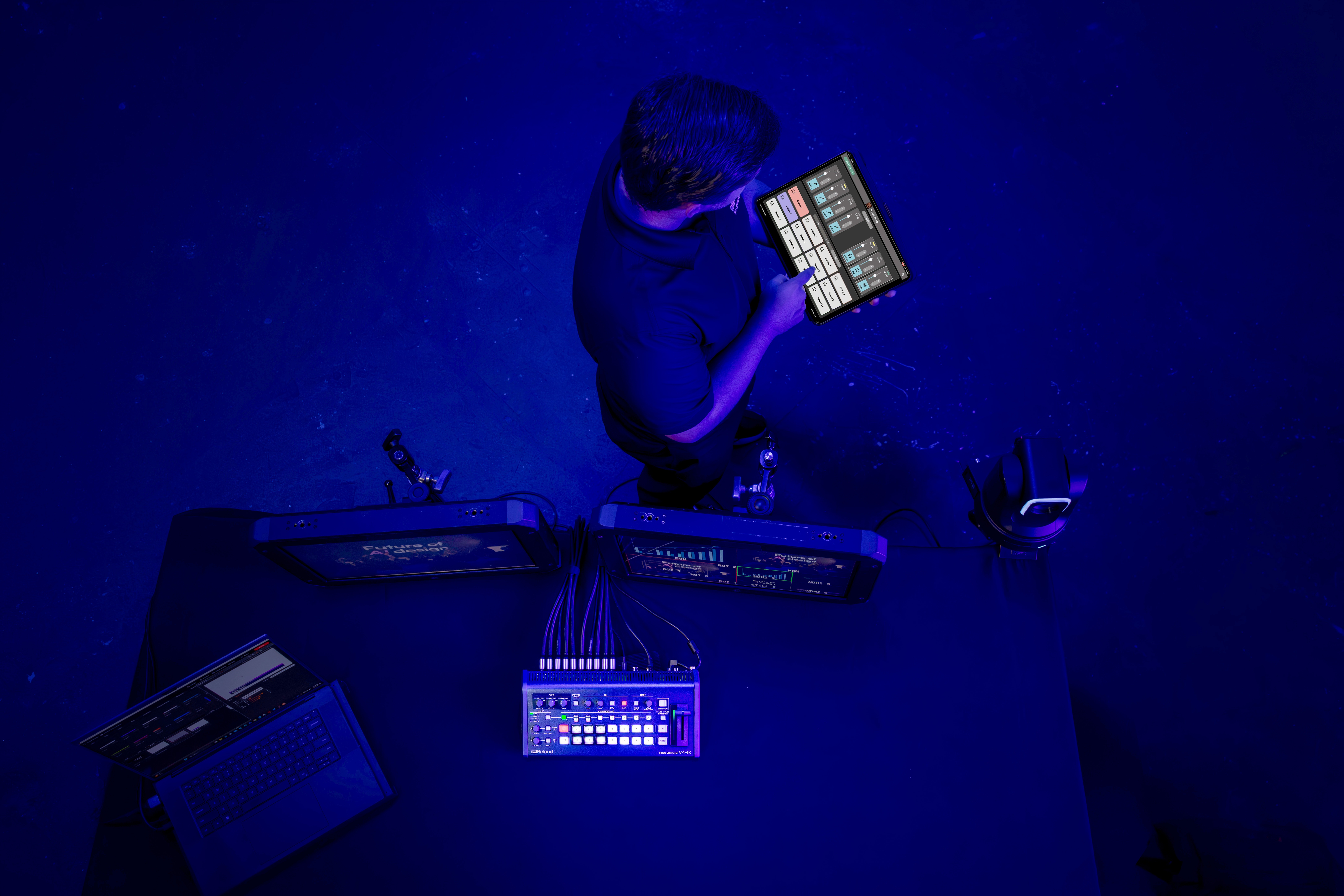 マルチビューにはROIモード専用レイアウトを搭載。iPad用アプリ「V-1-4K Remote」のROI専用画面と組み合わせることで直感的な操作を実現します。