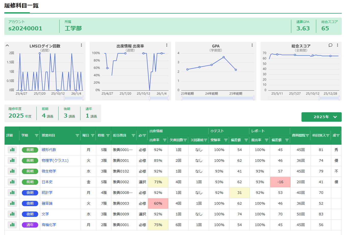 学生向けには、履修科目一覧とともに、出席率やテスト・レポートの状況を表示。