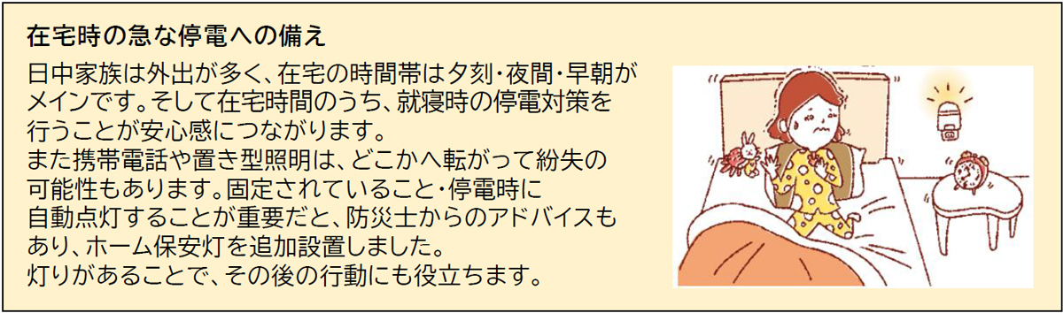 停電時に自動で点灯し災害時の初動対応に役立てる「ホーム保安灯」を、夜間・早朝の時間帯の災害に備え、主寝室となることを想定した居室と廊下※のそれぞれ1か所(合計2か所)に標準的に追加して設置することにしました。