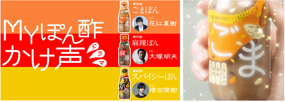 MYぽん酢をかける瞬間、いつものメニューに奇跡が起こる…。MYぽん酢をシズル感たっぷりに“かける”映像に、人気声優・花江夏樹さん、大塚明夫さん、増田俊樹さんが声を“かける”、奇跡の“かけ声”ドラマが誕生しました。「ミツカン MYぽん酢シリーズ」の1フレーバーにつき1話のドラマです。「第壱話 ごまぽんcv.花江夏樹」「第弐話 麻辣ぽんcv.大塚明夫」「最終話 スパイシーぽんcv.増田俊樹」と個性豊かな声優陣がそれぞれの物語を繰り広げます。