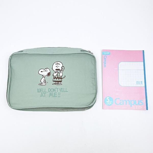 まずご紹介するのは、「スヌーピー 収納ポーチ(M) グリーン トラベル SNOOPY」。鮮やかな緑色が印象的です。サイズ:25cm×36cm×7cm。