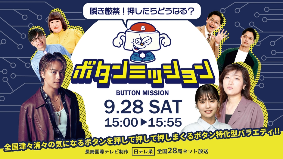 株式会社長崎国際テレビ(本社:長崎県長崎市、代表取締役社長:川畑 年弘)は、視聴者の代わりに全国津々浦々の気になるボタンを押して検証する、ボタン特化型バラエティ「瞬き厳禁!押したらどうなる?ボタンミッション」(日本テレビ系全国28局ネット)を2024年9月28日(土)午後3時から放送します。