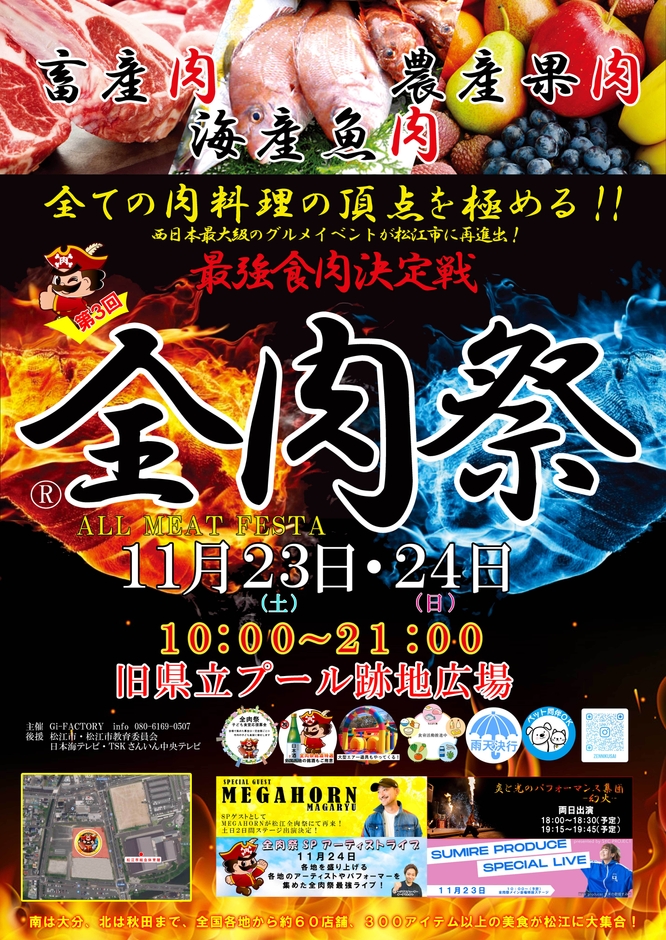 Gi-FACTORYは、島根県松江市の「旧県立プール跡地広場」にて開催する『全肉祭』が、令和6年11月23日~11月24日と迫っていることをお知らせいたします。