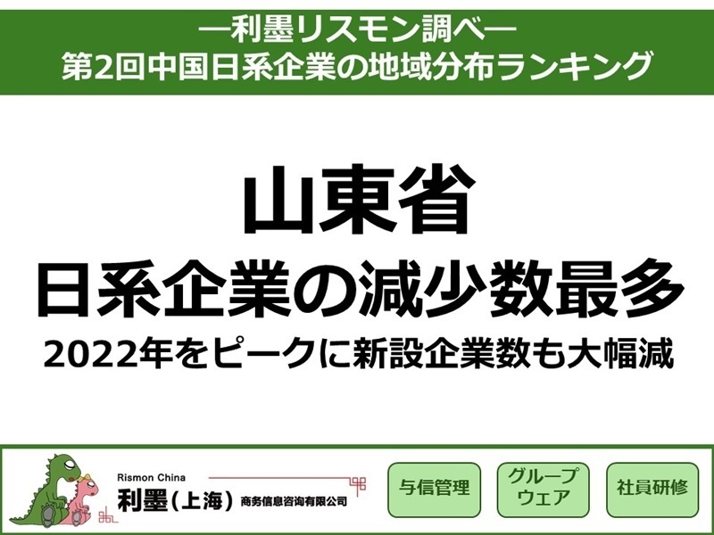 「第2回中国日系企業の地域分布ランキング」を発表 ~山東省:日系企業の減少数が最多、 2022年をピークに新設企業数も大幅減~