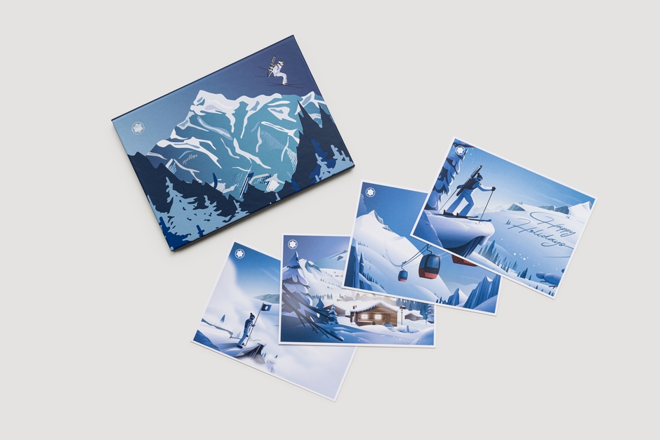 モンブランはホリデーシーズンに、税込30,000円以上お買い上げで、ご挨拶状やカードとして使えるモンブラン オリジナル グリーティングカード ボックスプレゼントキャンペーンを2022年11月19日(土)-2022年12月25日(日)まで開催いたします。モンブラン山でスキーを楽しむ人々や風景を描いたカードが4枚セットされた特製ボックスです。