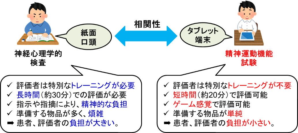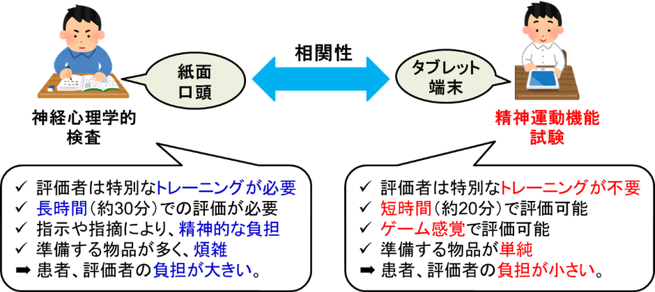 本研究では、神経心理学的検査への負担を理由に3名の脱落者を認めたことが限界として挙げられました。我々は、これまで抗ヒスタミン薬を服用する患者の集中力や注意力などの低下を検出する方法として、精神運動機能試験の臨床応用を目指して研究を進めてきました。今後は、精神運動機能試験をタブレット端末用にソフトウェア化し、1) 短時間で評価可能で、2) 患者の負担が少なく、3) 日常診療への導入が容易なタブレット端末版の精神運動機能試験を用いた認知機能評価法の開発を行います(図1)。