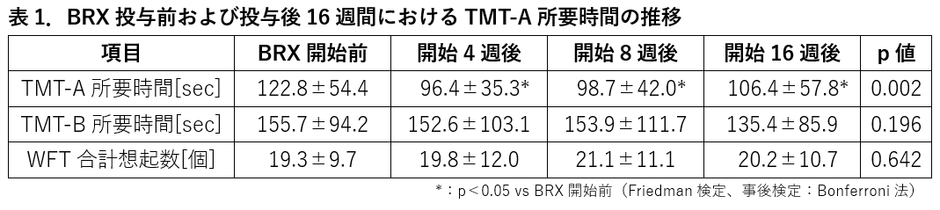 その結果、BRXの併用療法は神経心理学的検査のTrail Making Test(TMT)-A(注3)所要時間により評価された処理速度の有意な改善を認めました(表1)。一方、PANSS合計スコアは16週間において有意な変化が認められず、いずれの神経心理学的検査のスコアとも有意な相関関係を認めませんでした。したがって、併用療法として追加されたBRXは、精神症状の改善に付随するような二次的な認知機能の改善ではなく、直接的な認知機能の改善効果を有することが示唆されました。
