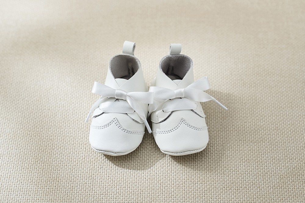 セットの主役は、白の柔らかな牛革とサテンリボンで仕立てたファースト・セレブレーションシューズ。 生まれてまもない赤ちゃんの足に優しくフィットし、お宮参りや100日祝いなど、家族の記念日にふさわしい一足です。サイズは10.5㎝のワンサイズ。