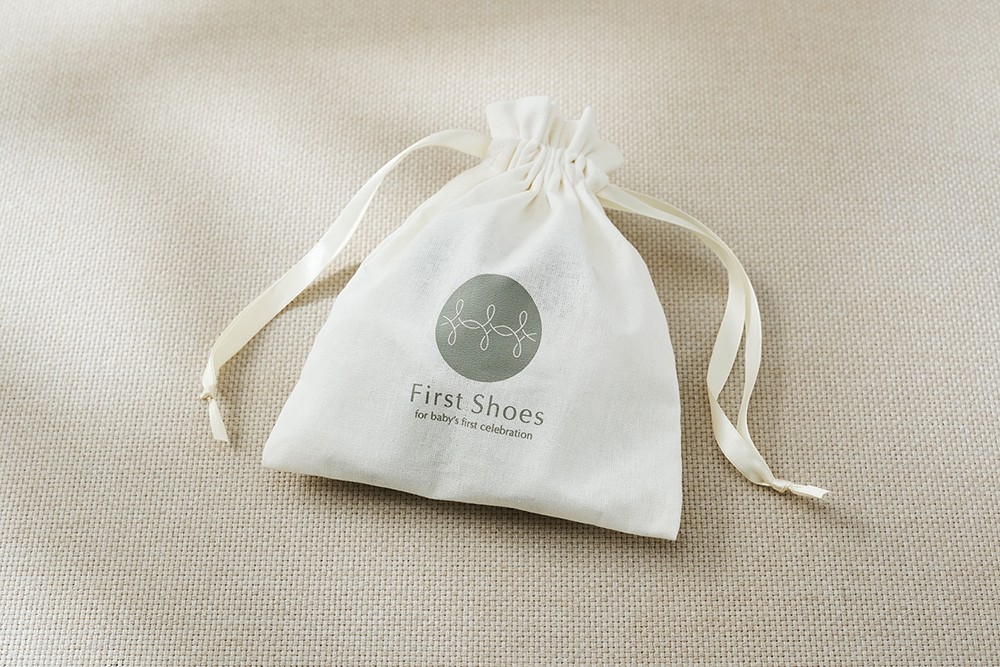ホワイトのコットン製巾着袋に靴を収めてお届け。やさしい肌触りと清潔感のある素材感が魅力。大切なはじめてのくつをやさしく守ります。