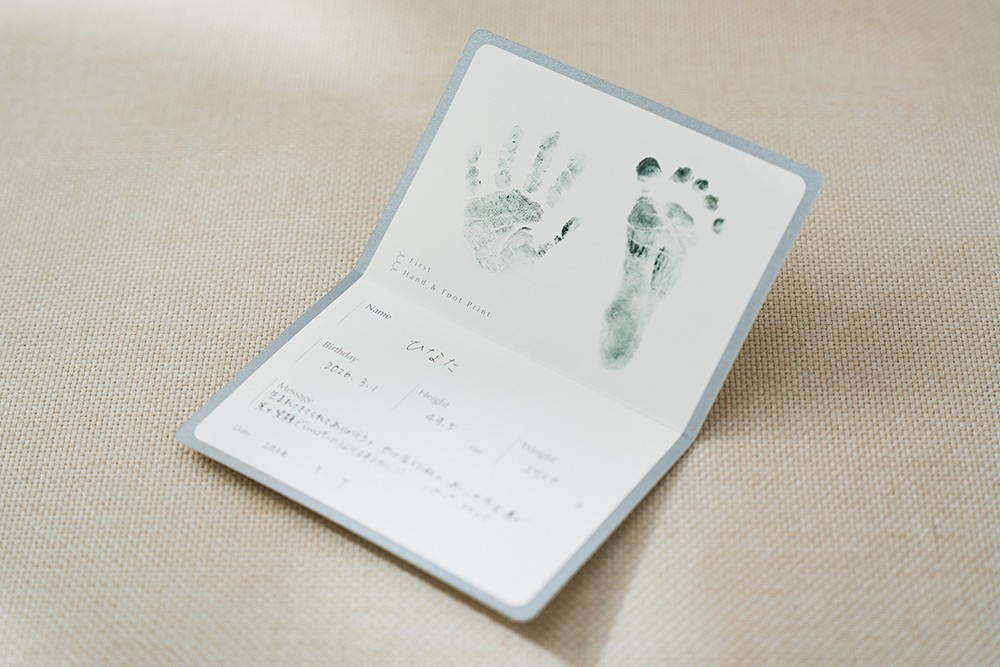 赤ちゃんの小さな手と足をそのまま記録できるメッセージカード。親から子への"はじめての手紙"を記せるスペースもあり、将来開くたびに家族の愛が蘇ります。「こんなに小さかったんだね」と語り合い、家族の愛が深まります。