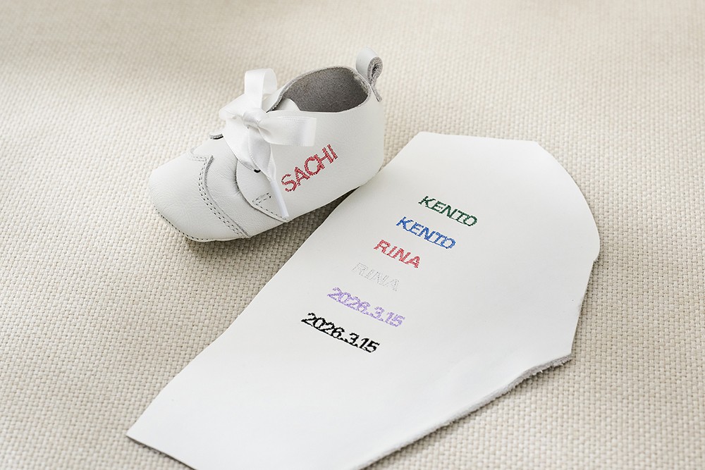 オンライン限定で名入れ刺繍のオプションをご用意。赤ちゃんのお名前を、靴に刺繍することができます(+2,200円 税込)。刺繍糸は「緑・水色・ピンク・紫・白・黒」からお選びいただけます。