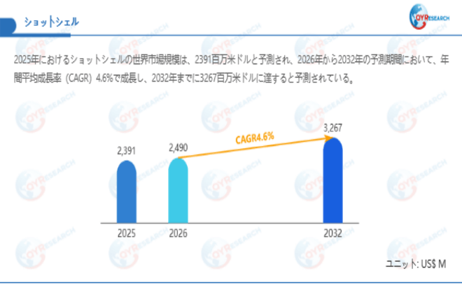 QYResearchが最新発表した「ショットシェル―グローバル市場シェアとランキング、全体の売上と需要予測、2026~2032」市場調査報告書によると、世界ショットシェル市場規模は2025年の約2391百万米ドルから2026年には2491百万米ドルへ着実に成長し、予測期間中4.6%の複合年間成長率(CAGR)で拡大を続け、2032年に3267百万米ドルに達する見込みである。